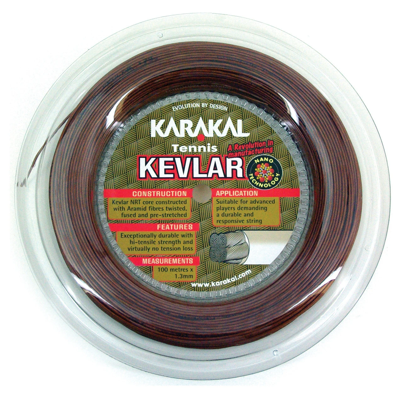 Kevlar is constructed with an NRT core and aramid fibres which are twisted, fused and pre-stretched. This produces an exceptionally durable and strong string with minimal tension loss.